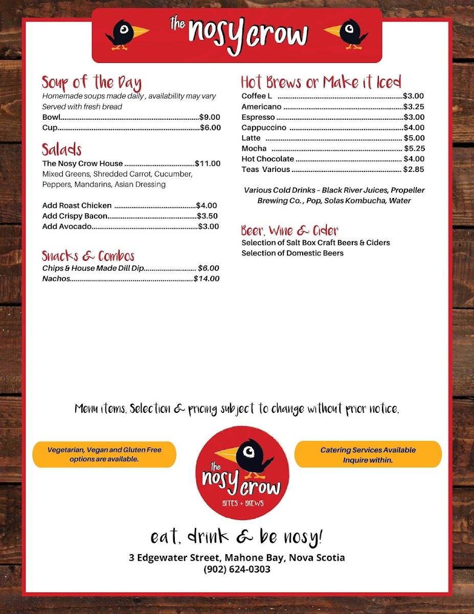 Welcome to The Nosy Crow Bites & Brews, a charming café nestled in the heart of Mahone Bay, NS. This delightful spot offers a menu that caters to both healthy appetites and indulgent cravings. The star of the show is the Nosy Crow House Salad, a fresh, vibrant mix perfect for a light meal. For those seeking something heartier, the café serves a range of flavorful Good-To-Go Bowls, including enticing options like the Indian Bowl, Thai Bowl, and the ever-popular Taco Bowl. Customers have praised the quality of the ingredients, noting how fresh and satisfying the dishes are. Pair your meal with a selection from their local craft beers and ciders, enhancing your culinary experience. With its inviting atmosphere and friendly service, The Nosy Crow Bites & Brews is a must-visit destination for both locals and travelers alike.